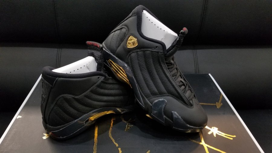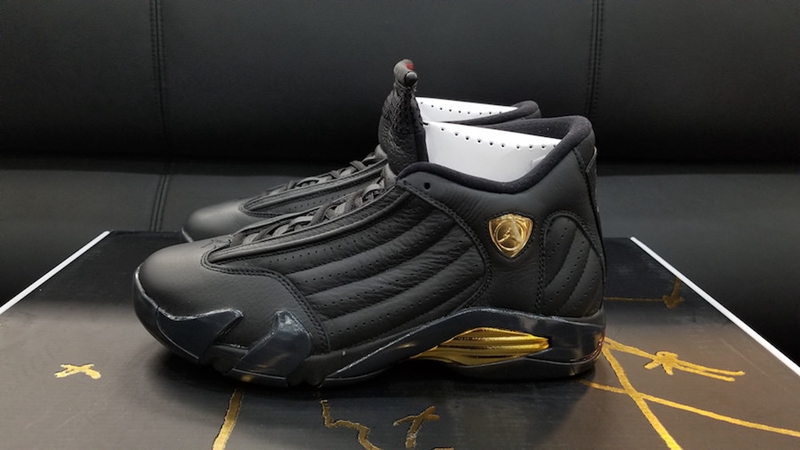 另一款 Air Jordan 14 “DMP” 则以一袭酷黑贯穿,黑装之下优质皮革的细腻质感,为之注入低调又沉稳的视觉基调。鞋身的盾牌标志和中底细节以鎏金装饰呈现,低调中又带来亮眼闪现,呼应冠军荣耀的主题。