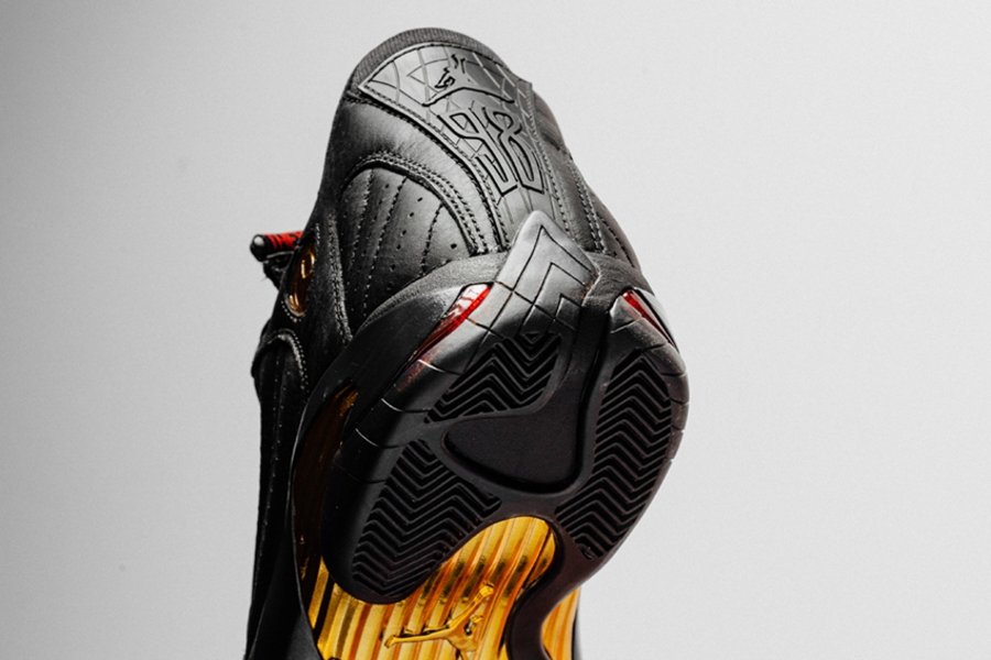 Air Jordan 14 则以黑金示人,承袭一贯的优质皮革有注入耀眼的金色点缀,沉稳的配色之下,又营造出精致的奢华感受!后跟的 23 字样同样以 98 字体替代,呼应冠军主题!