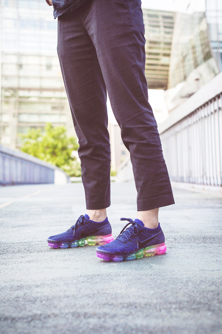 六色彩虹装扮的大气垫,托衬深紫罗兰色的 Flyknit 编织鞋身,近赏和远观都有不俗的视觉表现力,同时也是彰显个性的绝佳穿搭之选!