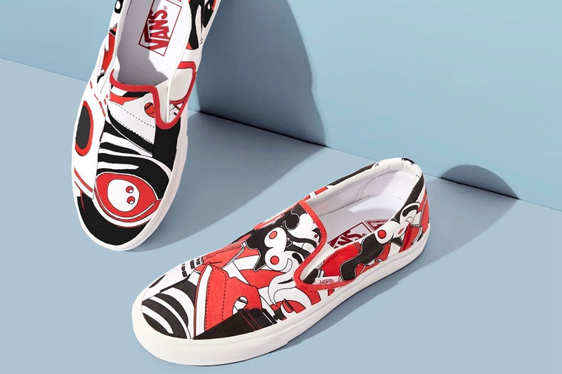 以 Vans 经典鞋型 Slip-On 为蓝本,别出心裁的采用手绘、刺绣、拼接、破坏等方式呈现。除此之外,双方还邀请来恶搞艺术家 Ava Nirui,发挥创意将作品提升至一个更高的趣味艺术层面,使原本低调简洁的一脚蹬造型,焕发出别具一格的独特的韵味。
