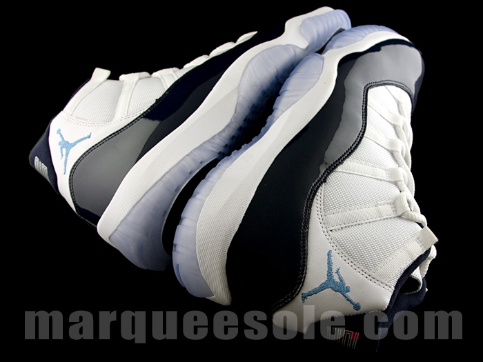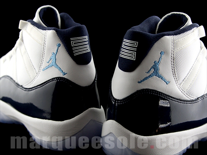 熟悉的漆皮装饰、白色尼龙布料、飞人刺绣和数字 23 的后跟胶印,都再现了 OG 的经典场景,而白色和深海军蓝的撞色搭配,也颇有 Concord 的气质!