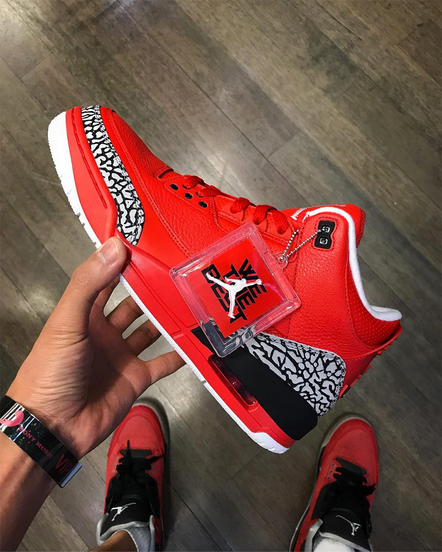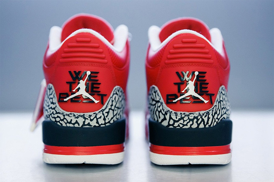 采用了 DJ Khaled 极为喜爱的大红色作为基调,还承接了 3 代鞋型最为经典最具标志性的黑灰爆裂纹!飞人吊牌和后跟标志都以 “WE THE BEST” 字样托衬,后跟挡片内侧还暗藏了 #majorkey、#blessup 和 #jumpman23 细节。