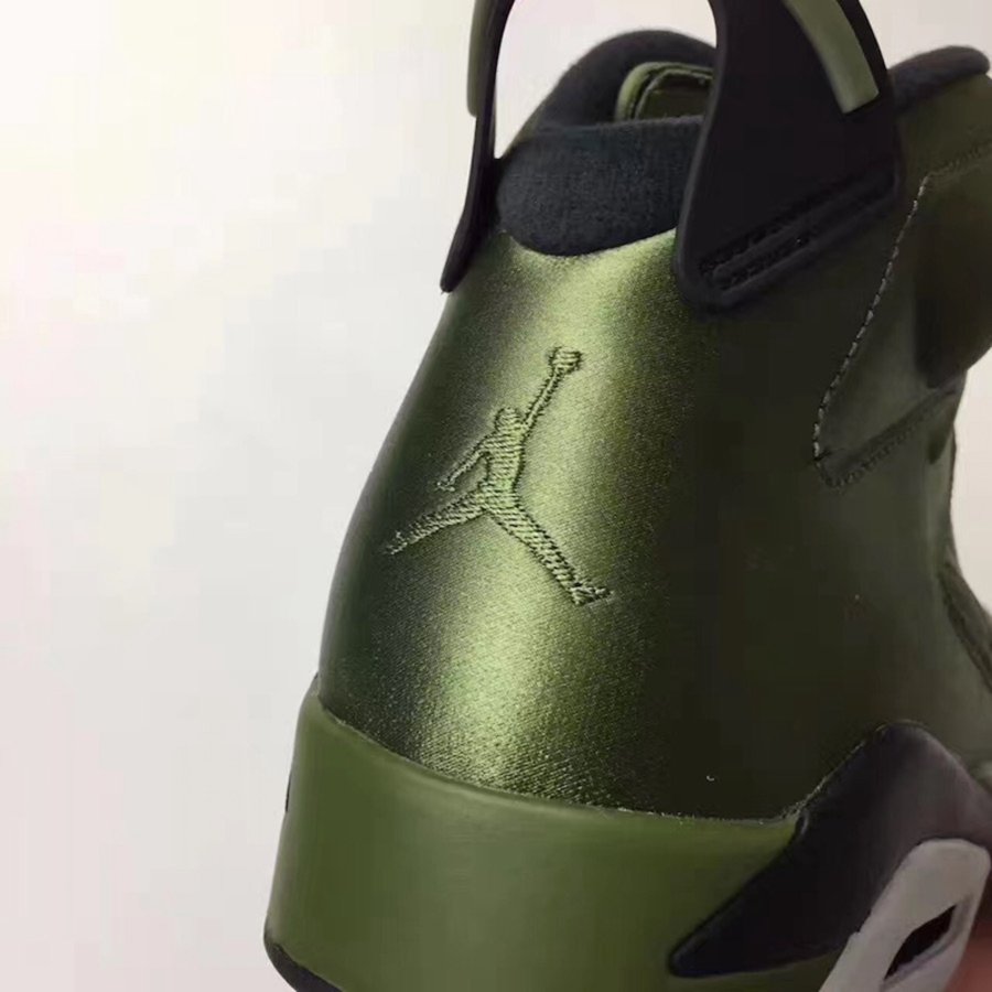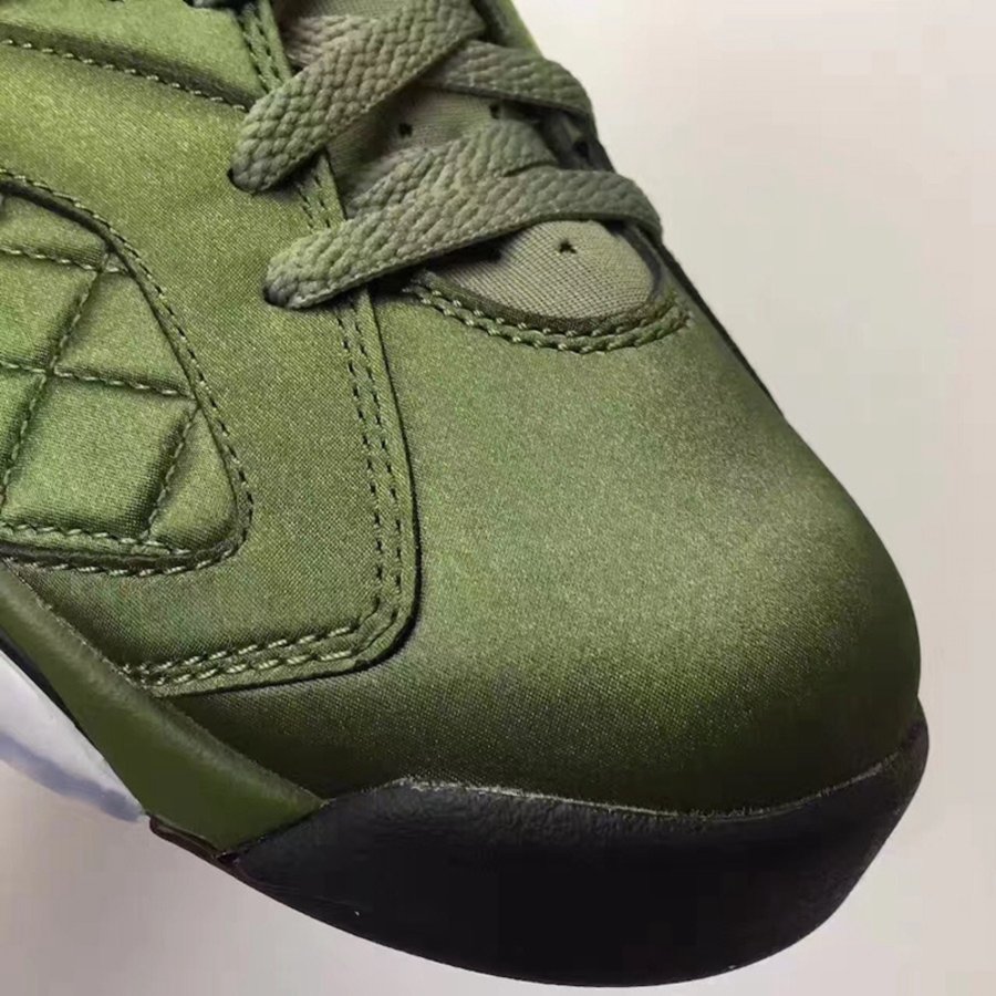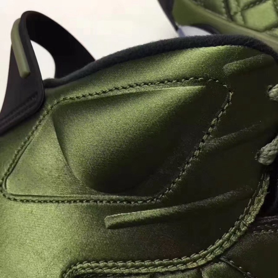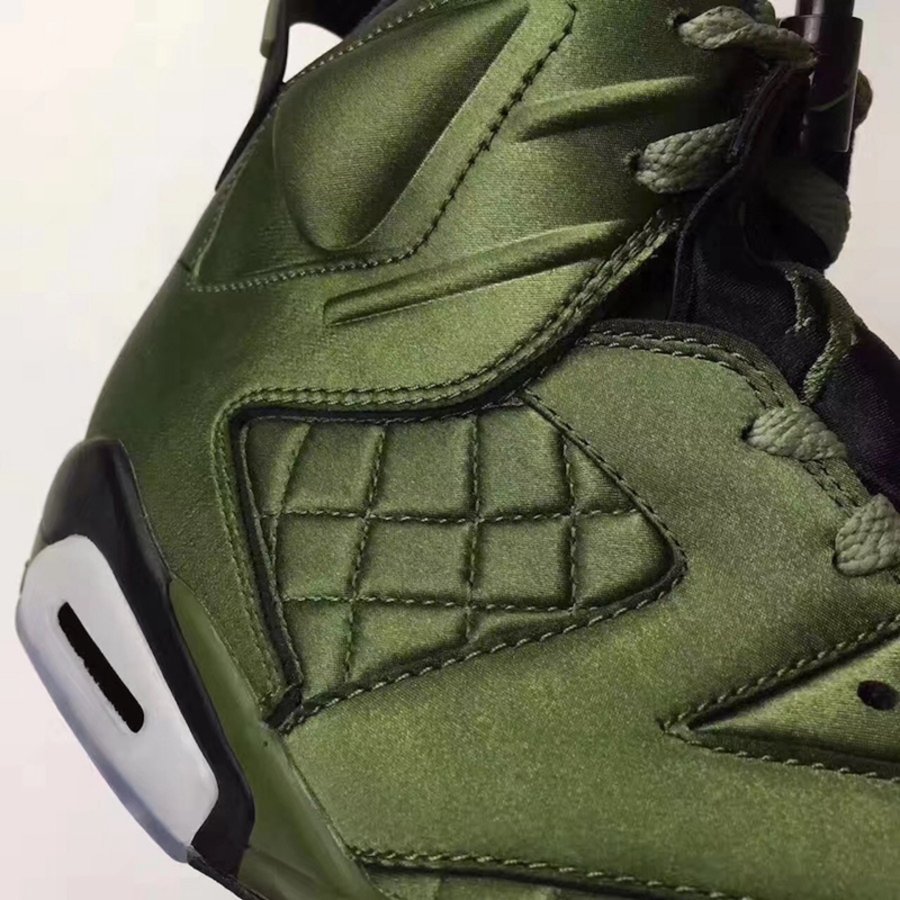 在保持 Air Jordan 6 经典鞋型轮廓的基础上,采用与夹克一致的尼龙防水面料制作鞋身,以橄榄绿色呈现。并别出心裁的将菱形方格车线纹理赋予鞋侧细节之中,整体造型颇有新意,散发的别具一格的奢华质感!
