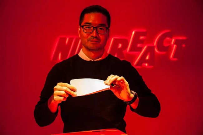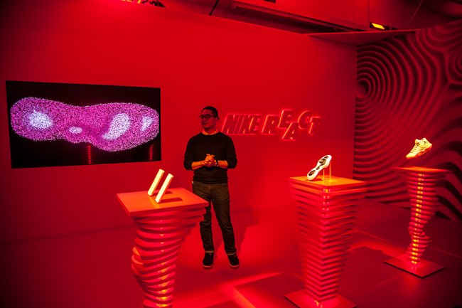 在展示全新缓震科技房间,设计师 Ernest Kim 向我们展示并讲述 Nike React 缓震科技,他手上拿着的像面包片一样的物质,就是 Nike React 材料。