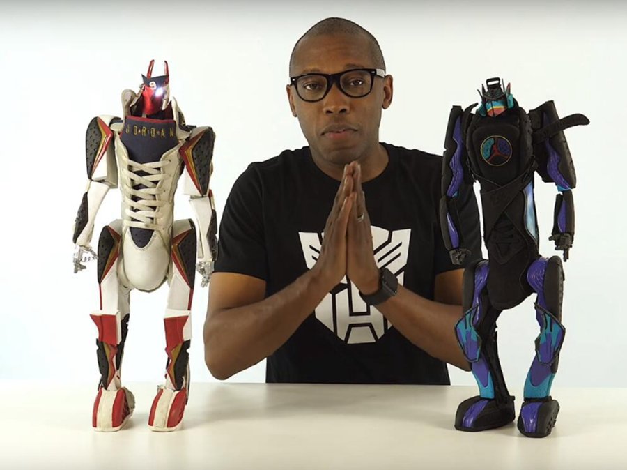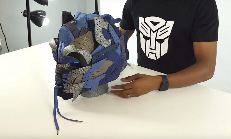 除此之外,Jacques Slade 还展示出了两款采用 Air Jordan 7 及 Air Jordan 8 为蓝本制作而成的 “变形金刚” 人物,以及选用经典鞋款 Nike Air Huarache 制作而成的主题面具。整体造型颇具新意,可谓趣味十足!