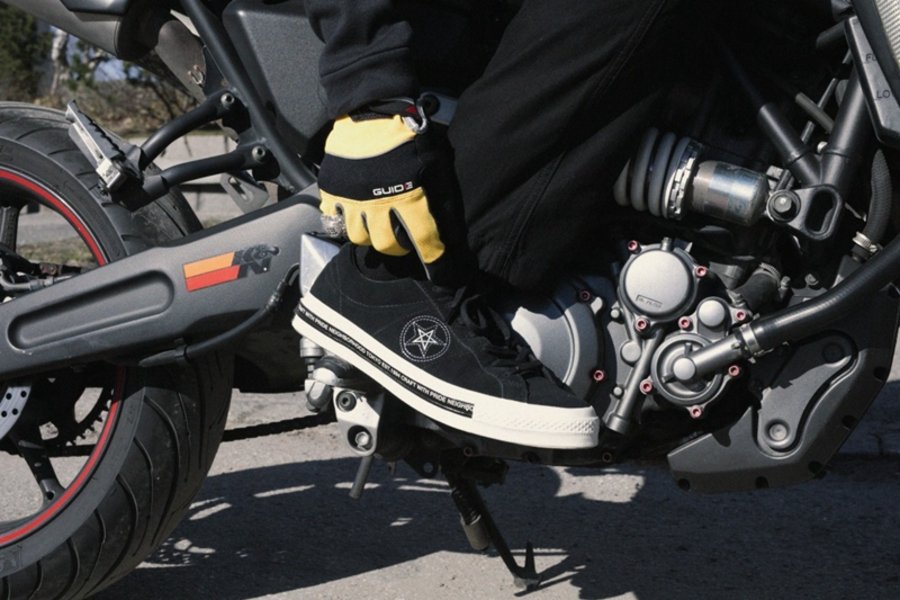 以简约沉稳的黑白装扮示人,赋予 NBHD 品牌机车文化理念,可谓硬汉气概十足,也难怪 MC Hotdog 为了它,肯脱下常年不离脚的 Air Jordan 1!