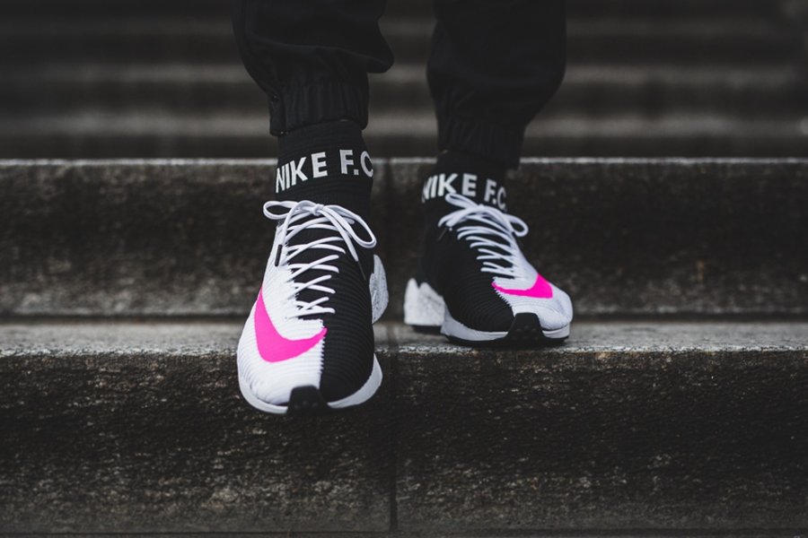 Flyknit 织物构建的黑白撞色鞋身,搭载全掌 Zoom Air 营造的顶级缓震脚感,鞋头一抹骚粉带来醒目的视觉冲击,更拥有 NIKE F.C. 主题加持。