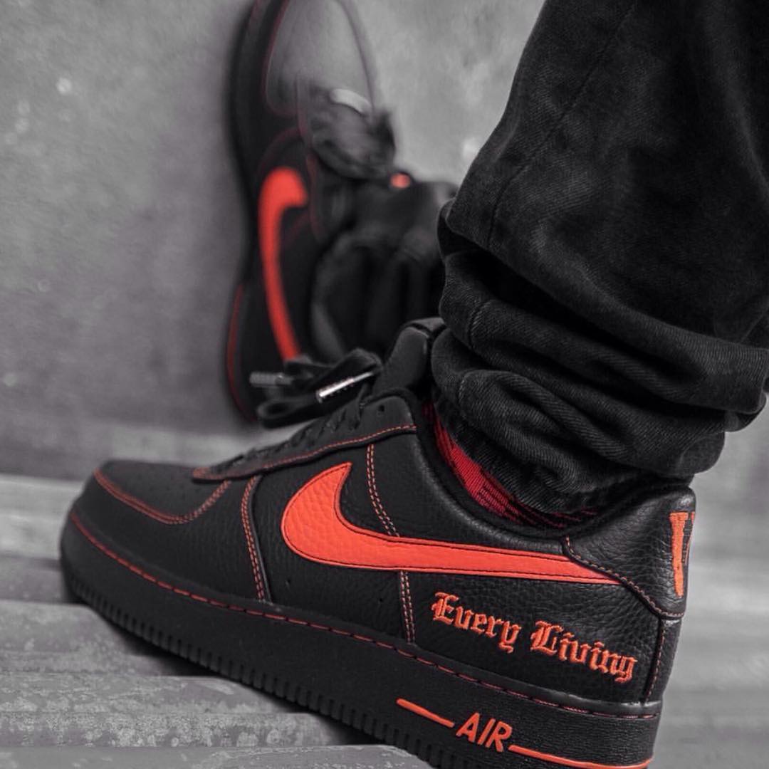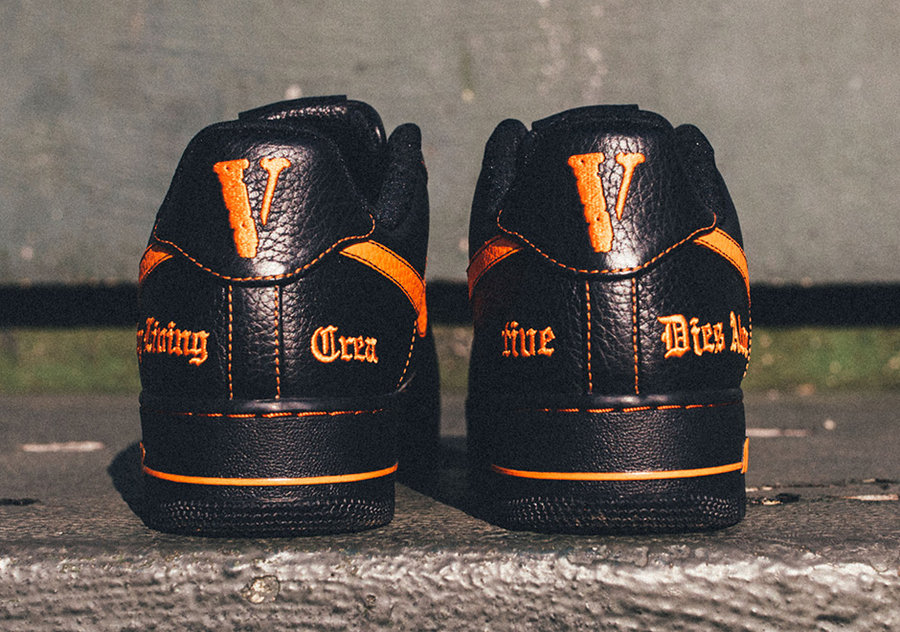 凭心而论这双 AF1 在外形上没有改变,但却将联名品牌 Vlone 的特点彰显的淋漓尽致:鞋身 Swoosh、“Air” 标识、刺绣部分和整体走线都使用橙色;鞋舌和后跟处有 Vlone 醒目的刺绣 “V” 字 Logo;两只鞋分别有刺绣的哥特体标识合成一句 “Every Living Creature Dies Alone”。这样一双有意义的球鞋也难怪冠希会爱不释手。