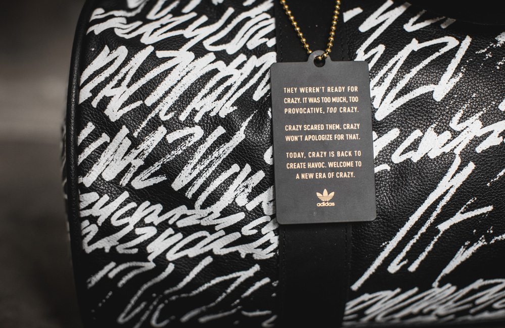 adidas Originals 使用 Crazy 1 和 Crazy 8 两双科比往日战靴打造 Crazy Capsule 套装。套装内包含一个布满涂鸦的优质皮革圆筒包作为鞋盒,一双 Crazy 8 ADV 和一双 Crazy 1 ADV,一黑一白两个绸缎面料的束口鞋袋,还有一枚金色印有 “CRAZY” 字样的手镯。
