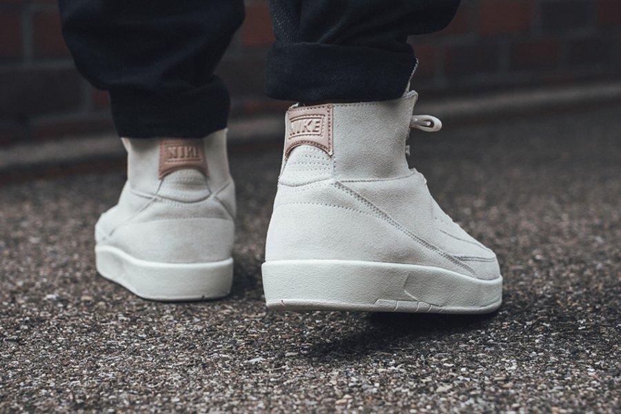 统一的色调,细节的弱化,使其褪去复古的运动造型,蜕变为更为时尚的短靴装扮,上脚表现与 Don C x Air Jordan 2 比也毫不逊色。