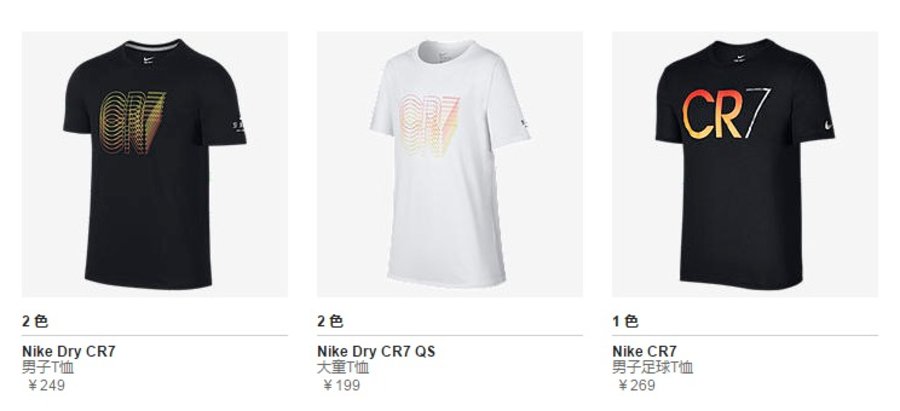 足球系列的短袖 T 恤特点鲜明,胸前醒目的 “CR7” 印花,贴合身材的版型裁剪,适于运动的舒适面料再加上比较实惠的售卖价格,让人无法拒绝。