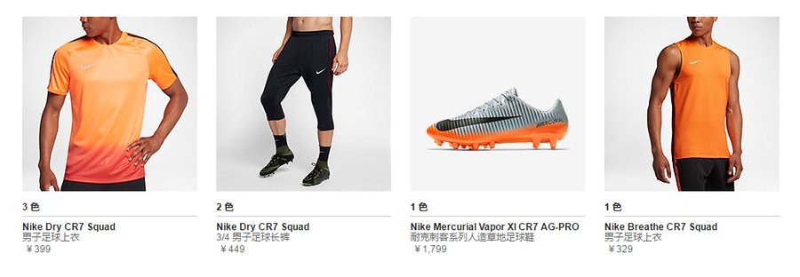 为纪念此次活动 Nike 推出 C 罗专属系列产品,包含运动生活、训练、足球三个系列。产品精神在于运动与潮流相结合,开创独树一帜的产品风格。
