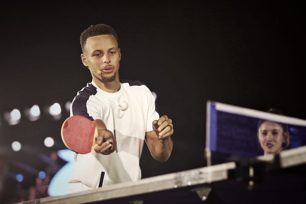 ▽库里与丁宁比拼乒乓球