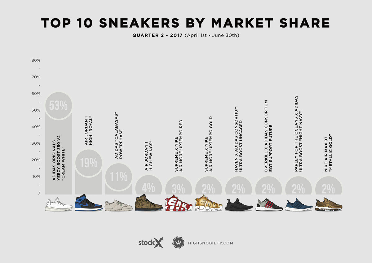 可见在这个季度的高端球鞋转卖市场里,侃爷的 Yeezy 350 Boost V2 “Cream White” 是最大的赢家!这是一次堪称完美的出击,很好的满足了市场对于 Yeezy 和小白鞋的需求。
