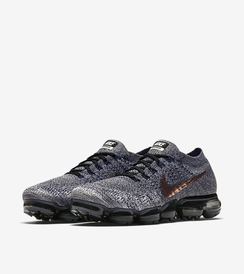 即将发售的两款 VaporMax 同属 “Explorer Pack” 系列,两双鞋以醒目的液态铜 Swoosh 设计抓人眼球。其中男款为深灰色 Flyknit 编织鞋面搭配黑色半透明气垫,而女款为白色 Flyknit 编织鞋面搭配水蓝色半透明气垫。