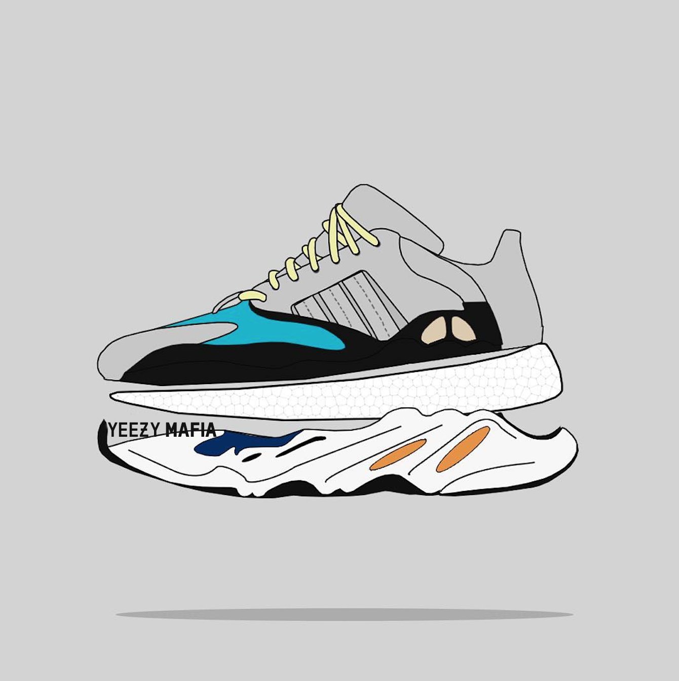 从网上曝光的鞋盒上可以看到,呈现了 Yeezy Boost 700 的字样,说明带有 Boost 缓震科技,而 Yeezy Mafia 为大家做出示意图,外底将整个 Boost 包裹!