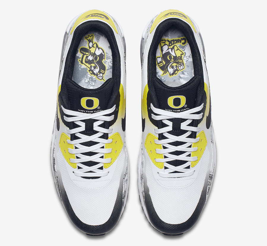 鞋款主要以黑、白、灰、黄四色为主,鞋舌点缀俄勒冈大学标志性的 “O” 字 Logo,同时标注有 “WIN THE DAY WIN THE FIGHT” 字样,最大的亮点在于鞋身和鞋垫都加入同主题涂鸦式标语,整双鞋风格鲜明,醒目独特。