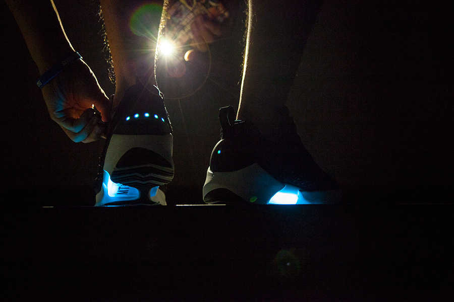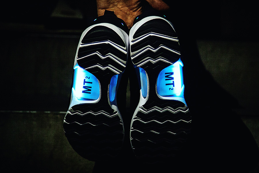 HyperAdapt 1.0 中底足弓处的发光装置,不仅将电机芯片隐藏在其中,还能通过不同的灯光色彩显示电量。蓝色是满电状态、黄色代表电量使用至一半,红色灯亮说明电量不足,需要进行充电。