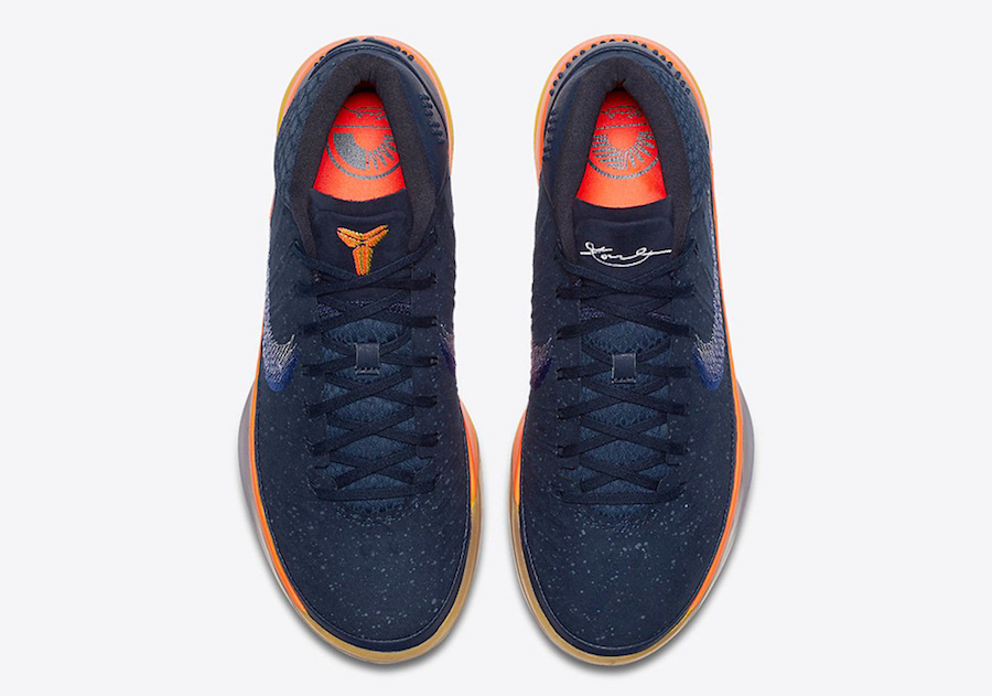 鞋款以午夜蓝覆盖鞋面,其上添加泼墨细节,中底从上到下呈现出橙黄渐变的效果,搭载冰蓝色水晶大底,整体色彩从下至上表现了日出的壮观之美。而在细节方面,鞋舌的 Kobe Logo 和鞋身的 Swoosh Logo 都以双层刺绣的方式达到重影的炫酷效果。