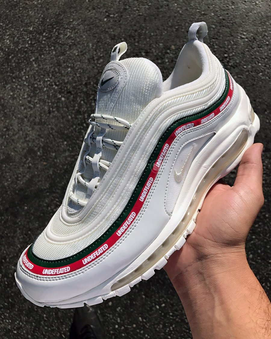 从图片中可以看出,这款全新的 Air Max 97 “UNDFTD” 采用白色装扮为主基调,注入漆皮材质提升质感。最大的亮点在于鞋身的 3M 波浪反光条,改为红绿两色示人,印有白色 “UNDEFEATED” 字样呈现,辨识度极高!