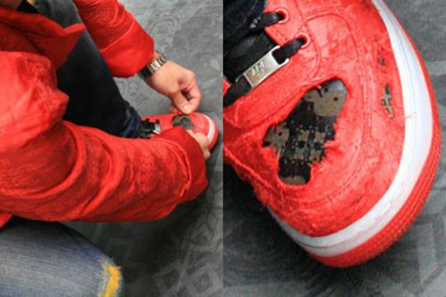 将原本的红色丝绸鞋面撕掉或烧除之后,底层则会展露出印有镭射图案的深褐色皮革,寓意为 “永远不要以貌取人”。