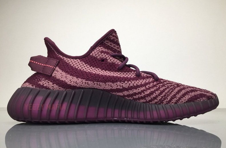 这双 adidas Yeezy Boost 350 V2 “Red Night” 通体以迷人的酒红色为主调,Primeknit 编织鞋面上搭配粉色斑马纹,标志性的 “SPLY 350” 字样则采用亮粉色呈现。