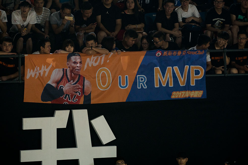 最后时刻,观众用用色板构成的标语 “MVP”!威少倍感惊喜的同时深受感动,赞叹球迷们太热情了,感谢他们一直以来对自己的支持,下赛季将会用更好的表现来回报给球迷!