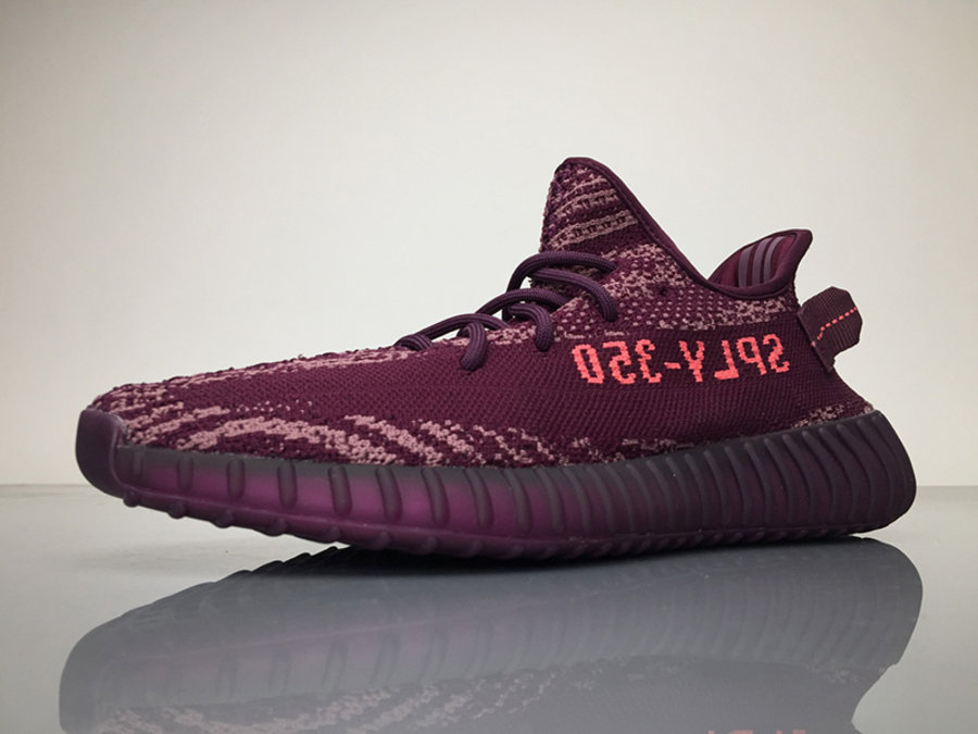 整体造型以酒红色为主基调,Primeknit 编织鞋面加入浅色斑马条纹,鞋身侧面油漆条被取消,取而代之是简约的橘红色 “SPLY 350” 字样,十分艳丽!