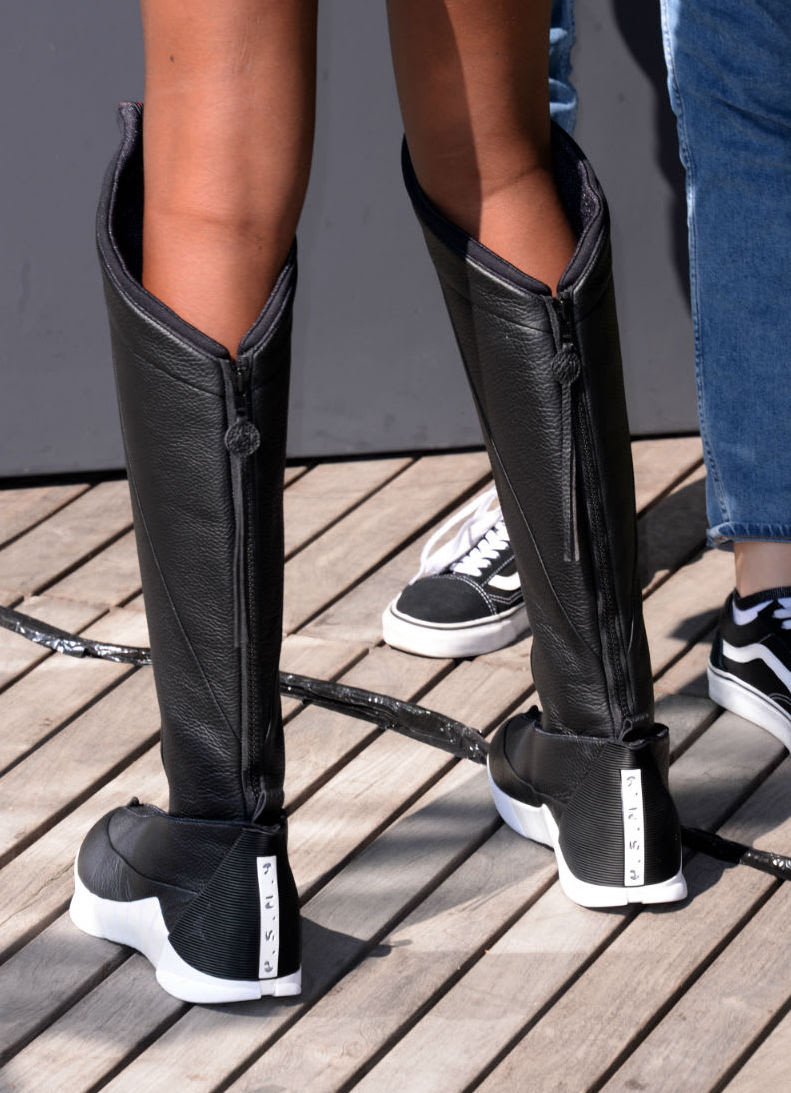 最特别的当然是惊艳秀场的 PSNY Air Jordan 15 Knee High Boot,Air Jordan 15 经典的战斗机鞋型得以延用,整体全部使用优质皮革打造,亮点在于夸张的过膝高筒让人印象深刻,后跟还加入拉链设计更添细节质感。