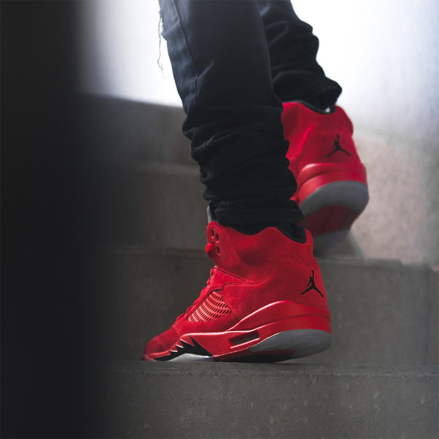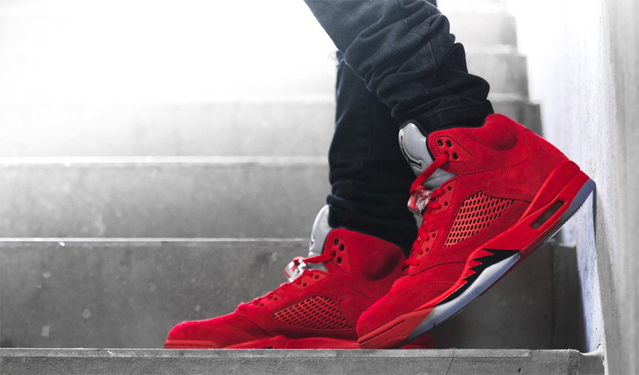 一双是讨好的红色麂皮新装扮,不仅色调艳丽、质感非凡,Air Jordan 5 的经典造型也颇具侵略性,上脚的夺目效果必然满分!