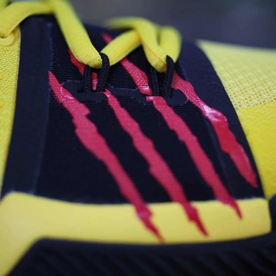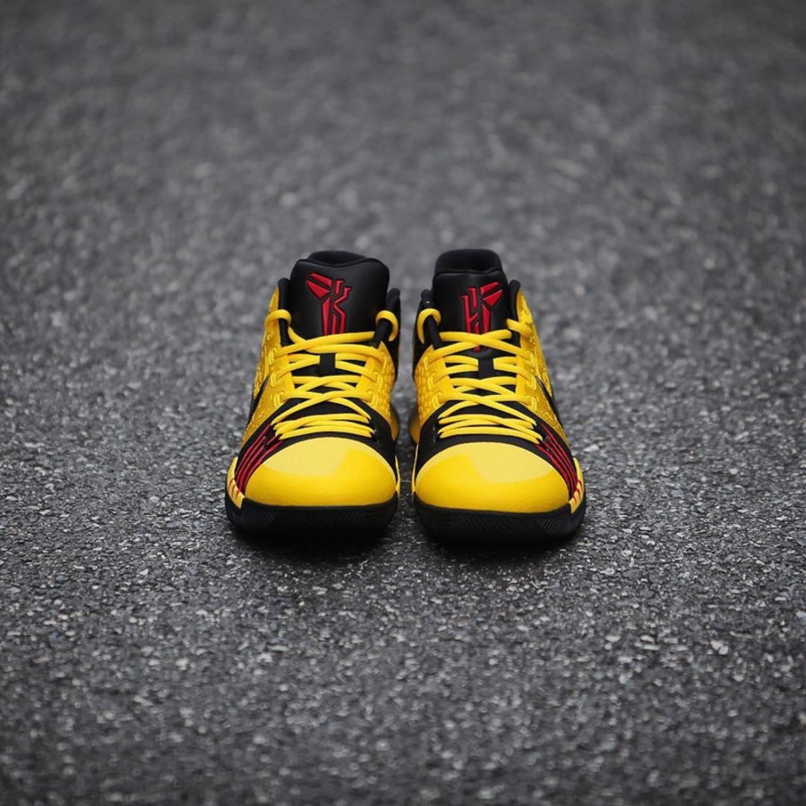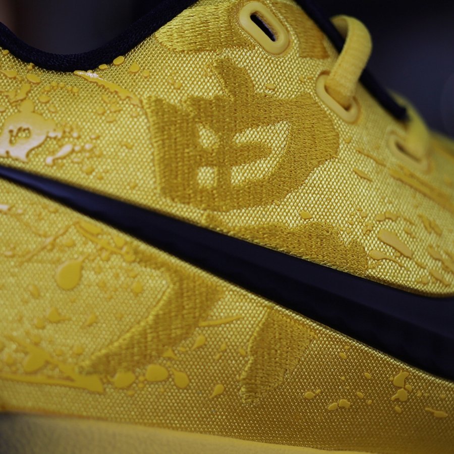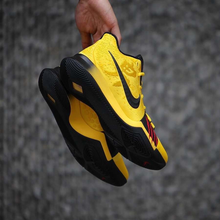 本次以欧文最爱的 Kobe 5 "Bruce Lee" 为设计灵感,不仅采用了相同的黑黄配色方案,更还原了鞋身醒目的四道血痕细节!鞋舌处将科比和欧文的个人 Logo 合二为一,内外侧则分别选用 “礼勇” 元素搭配曼巴蛇皮纹路呈现,新老交融,诚意满满!