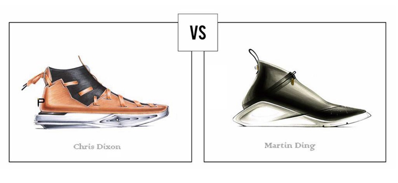 经过大半年的层层筛选与淘汰,美国设计师 Chris Dixon 与华人设计师 Martin Ding(丁力) 从全世界 4000 多份球鞋设计作品中脱颖而出,成为了 2017 年度两强选手。