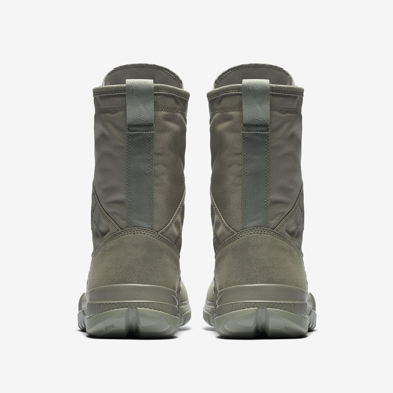 鞋款都以超高帮呈现,其中 Nike SFB Field 8" 发布了黑色和灰绿两款配色,鞋面分别以黑色优质皮革和灰绿麂皮打造鞋头,高达 20cm 的鞋帮使用速干透气纤维帆布,搭配橡胶外底和微高后跟,可在步行或下坡跑步时,带来出众抓地性能。