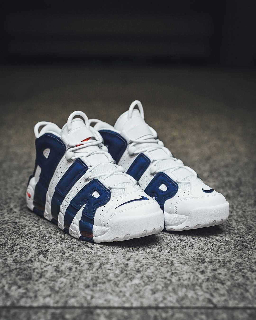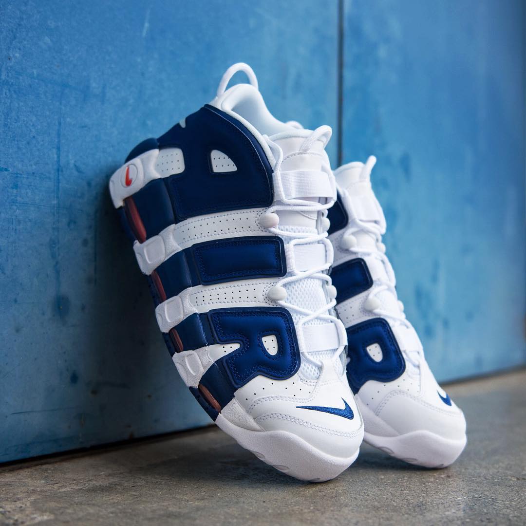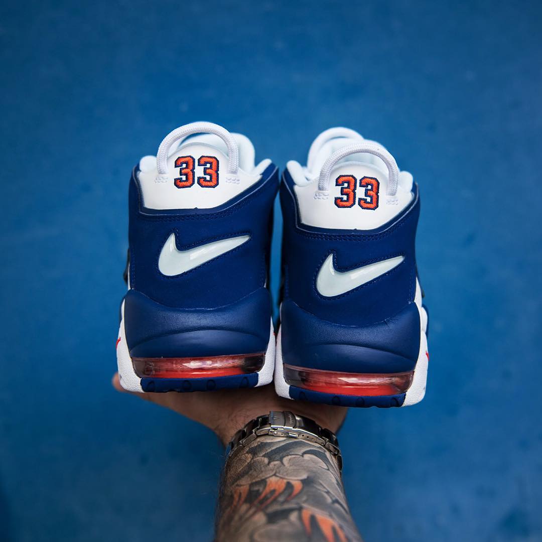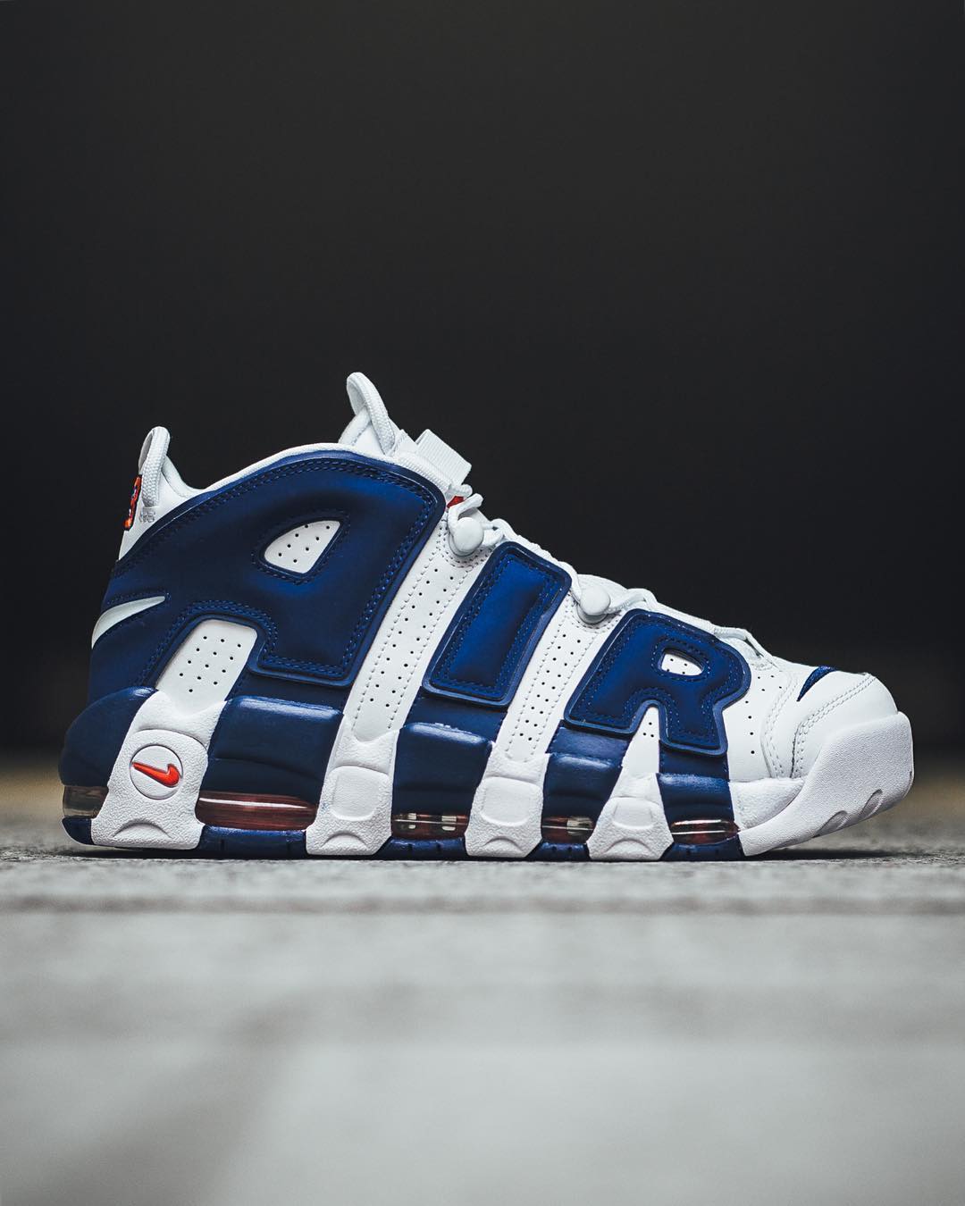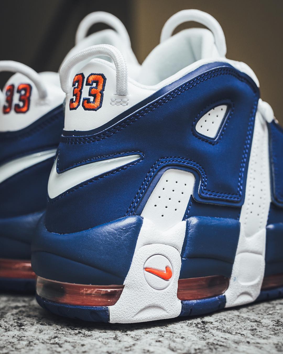 一改传统 Air More Uptempo 的纯色装扮,在白色轮廓之上辅以蓝色 AIR 勾勒,全掌开窗气垫、后跟 33 号文字以及细节均以亮橙色点缀,极为醒目!