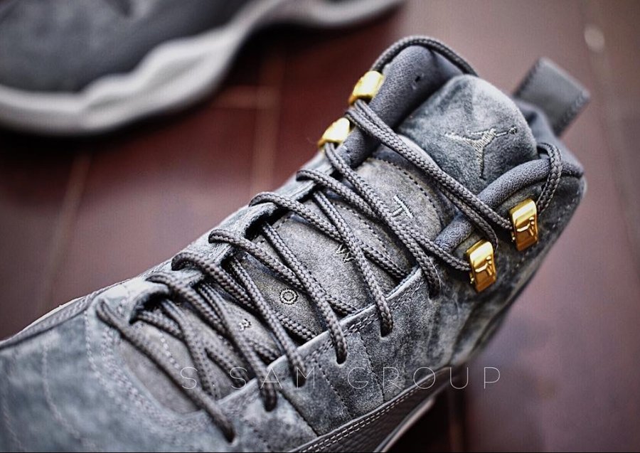 可以看到鞋款以质感表现出色的深灰色麂皮覆盖鞋身,最大的亮点在于将 Air Jordan 12 “Taxi” 标志性的金扣设计融入其中,瞬间提升了整体的辨识度和奢华感,也勾起了人们的购买欲望。
