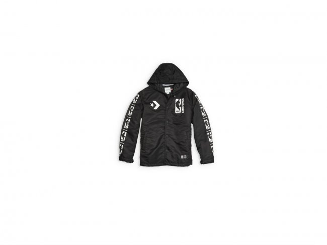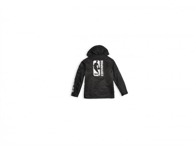 简约硬朗的黑白配色,印有 Converse 与 NBA logo,全身装备包括棒球外套、卫衣、教练外套及束口运动裤等等。