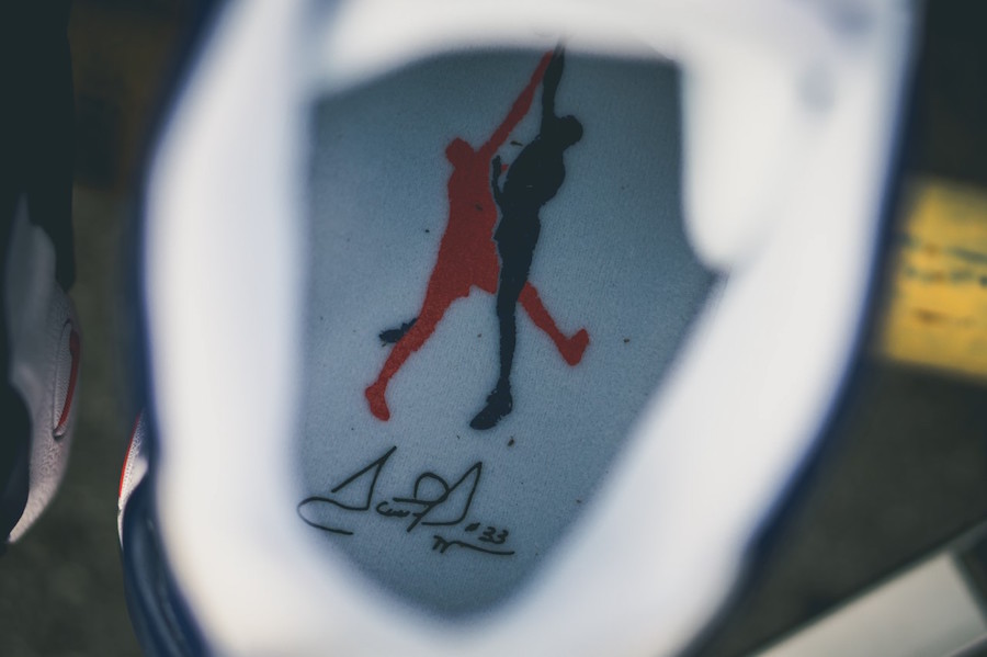 鞋身以白蓝相间呈现活力清爽的视觉主线,橙色全掌 Air Max 气垫与上方 Mini Swoosh 格外风骚,后跟 33 球衣号码与鞋垫上皮蓬隔扣尤因的一幕相呼应,直击尼克斯配色主题。