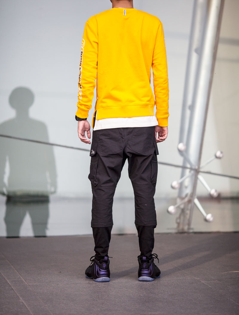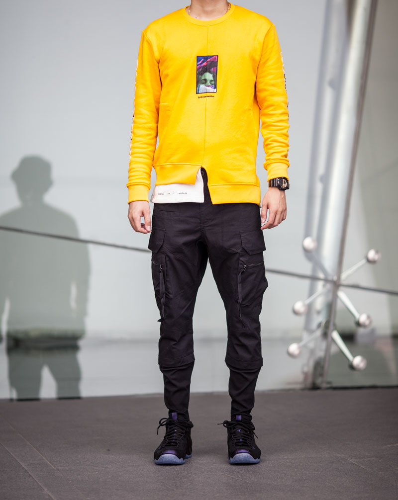 2.服饰版型:搭配服饰时最好选择较为宽松的版型,特别是裤装一定不要太贴身,否则鞋就会显得过于笨重,也让本身扁长的鞋型突兀了许多。