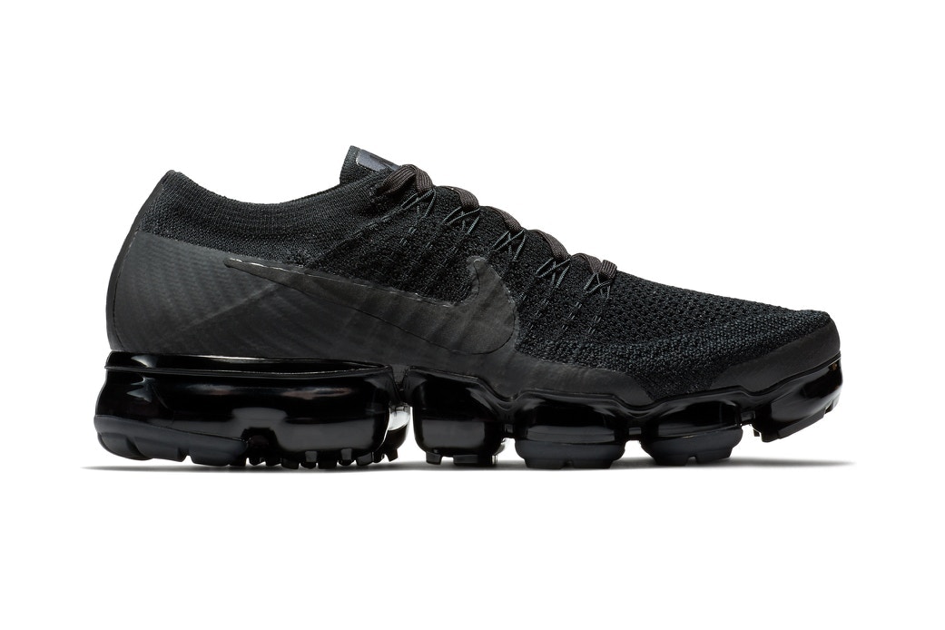 其中关注度最高的应该是全新的 “Triple Black" 配色,鞋款最大的改变在于鞋身 Flyknit 编织鞋面改为毫无杂质的纯黑色,同时曾经半透明的黑色 Air VaporMax 气垫也改为近乎不透明的黑色,相比前一版本,这双全新的 “Triple Black” 黑魂气息更加浓郁!