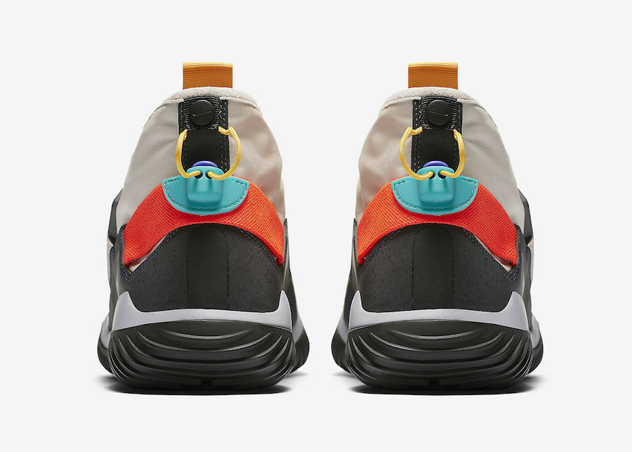 鞋款以浅卡其搭配黑色为主调,首次改变了纯色鞋面的设计,在细节中加入橙、黄、青三种鲜艳颜色点缀,鞋垫更使用紫色,搭配灰色中底过渡,整体辨识度大大提高。鞋身采用防水尼龙材质,再加上新颖的 Fidlock 磁力搭扣与后跟松紧索带的鞋带系统设计,让这双鞋的穿脱感受更加舒适便捷。