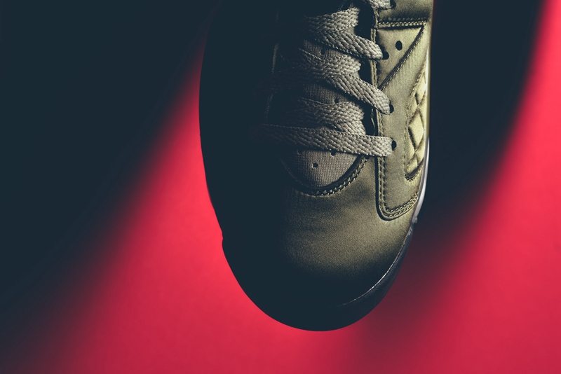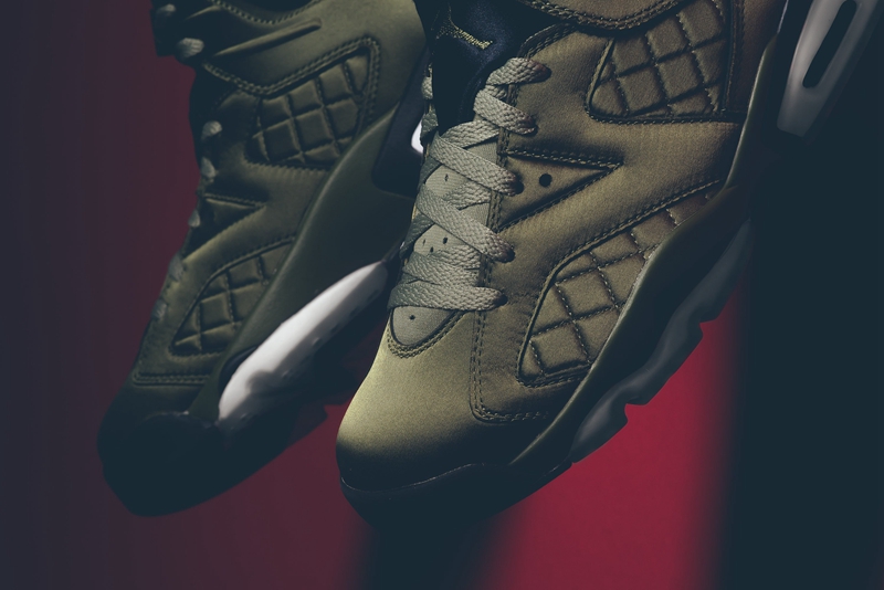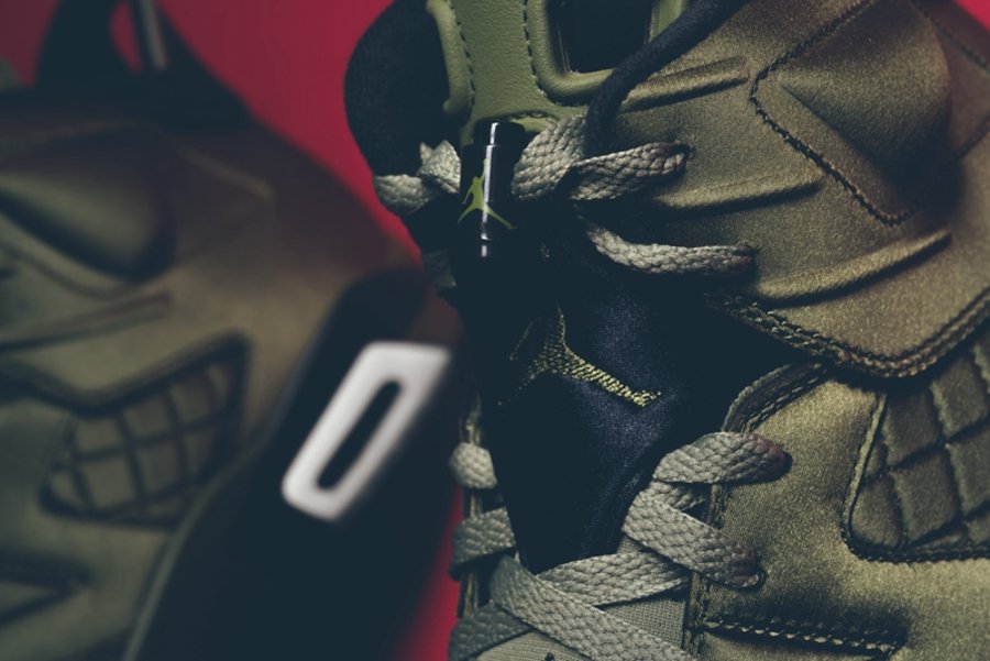 以 Michael Jordan 在 1991 年电视节目出镜时穿着的飞行夹克为灵感,采用与夹克一致的尼龙防水面料制作鞋身,以橄榄绿色呈现。并别出心裁的将菱形方格车线纹理赋予鞋侧细节之中,搭配复古韵味十足的鞋盒,整体造型颇有新意,散发的别具一格的奢华质感!
