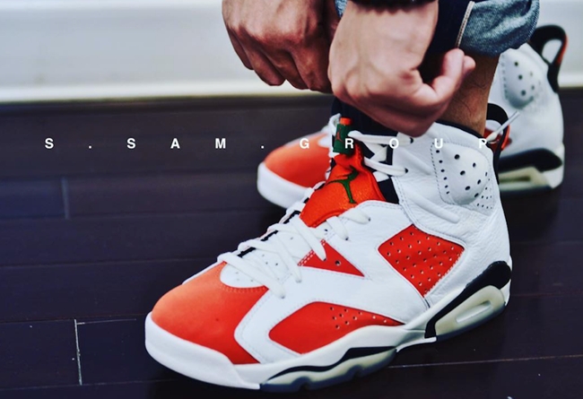 白橙配色与 Air Jordan 6 “胭脂红” 相似度极高在鞋带扣和鞋垫上都印有佳得乐经典的闪电 Logo,整体以橙红色、白色为主,Jumpman Logo 等细节使用绿色点缀。