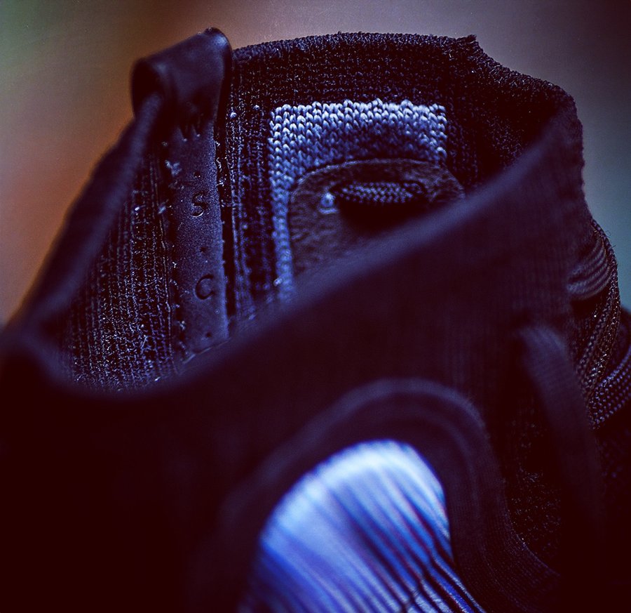 鞋领前后都人性化的设计出凹槽,提升穿着中脚踝及跟腱部位的灵活性与舒适度。后方鞋领向下延伸处同样是弹性织物,避免启动时卡跟腱的问题发生。热熔条下方内置弧形 TPU,保证稳定及安全。