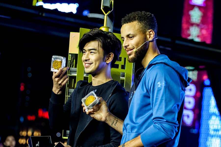 当晚人气偶像陈柏霖也来到现场,代表中国球迷为库里送上一份 Under Armour 特别定制月饼,除包装以迷你 UA 鞋盒示人外,月饼上更注有 SC 专属标志,独具匠心。送上全国库蜜的祝福,希望在新赛季再创辉煌。爱吃甜食的萌神马上就吃掉一个,赞不绝口。
