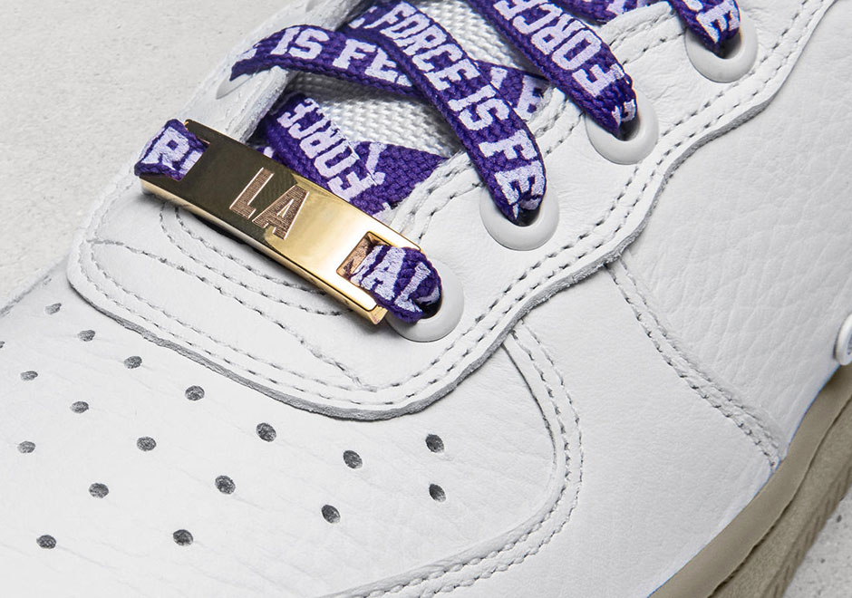 鞋款在八月份发售的 SF-AF1 Mid “Ivory” 基础上增添细节,鞋帮外侧加入紫金 Swoosh Logo 刺绣,绑带刺绣黄色 “LOS ANGELES” 字样,鞋带改为紫色,同时配有金色鞋带扣和鞋带头,最为亮眼的细节在于鞋身内侧点缀淡紫色花朵篮球图案,做工极为细腻!