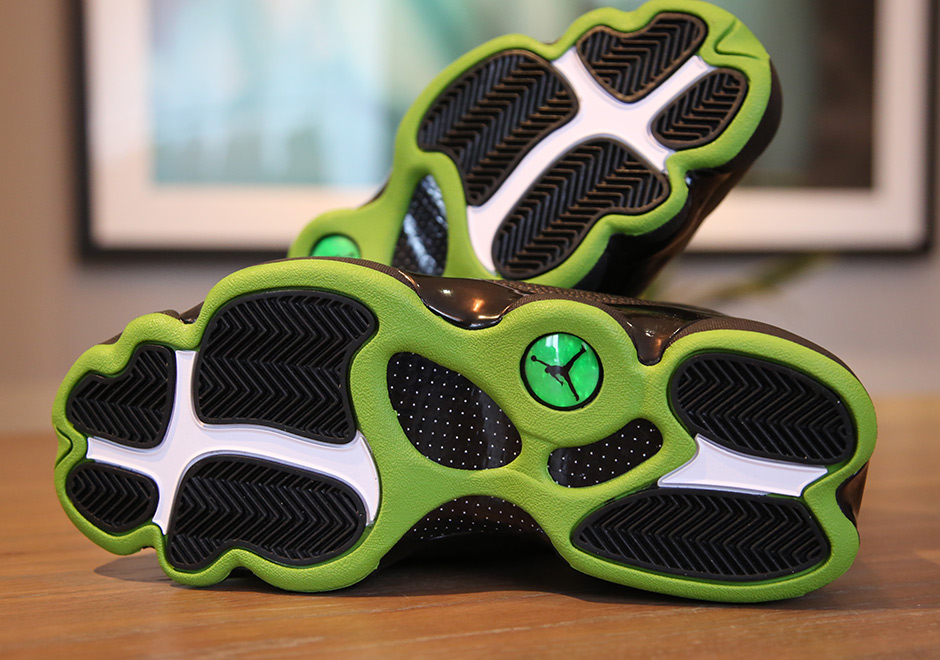 鞋款以大面积的黑色皮革搭配珍珠鱼皮材质覆盖鞋身,标志性的绿色猫眼与醒目的绿色鞋底交相呼应,传闻鞋款将完美还原了元年配色的所有细节,也算弥补了 Air Jordan 13 “Playoffs” 在今年跳票的遗憾。
