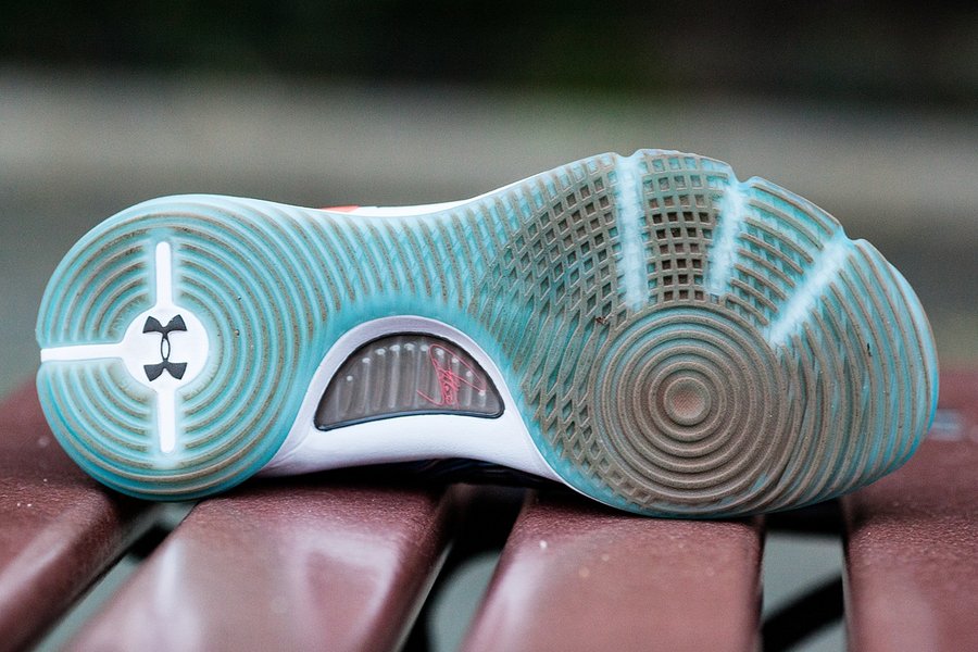 缓震方面延续 UA 一贯水准,脚感并不会像 Boost 那样下陷明显,趋于稳定并富有韧性,激烈对抗中更为踏实,不拖泥带水。