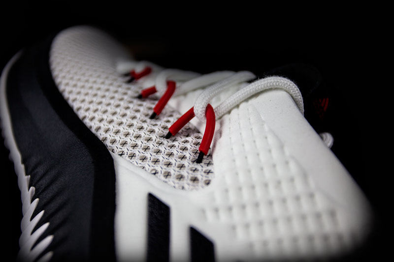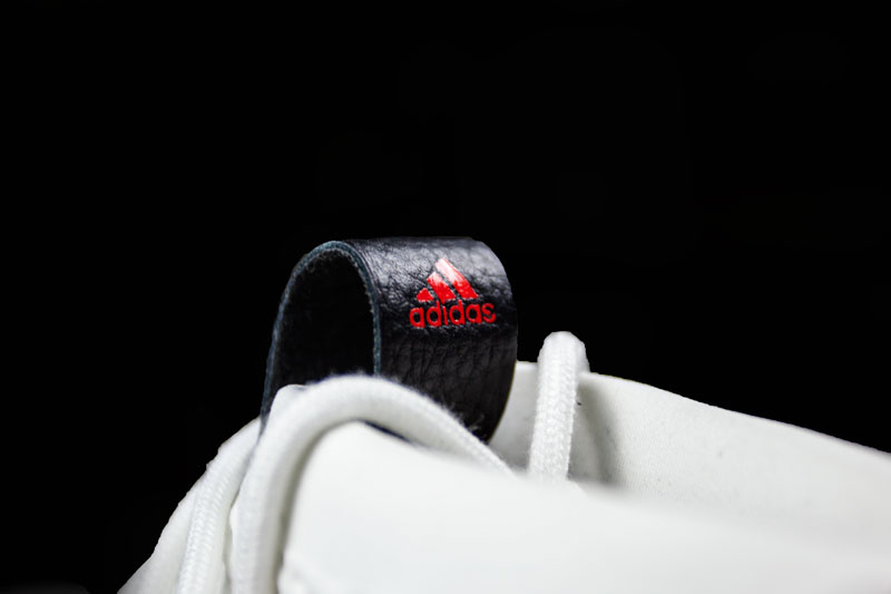 优质皮革打造的鞋舌拉环,外侧印有像是一组数据的白色数字和红色利拉德个人设计 Logo,内侧印有同样是红色的醒目 adidas 标志。