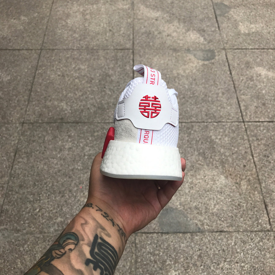 一款中国风范浓厚的新品球鞋亮相!眼前的 adidas Originals NMD R2 在白色基调之下以鲜红喜庆的 “囍” 字标志呈现,红色的鞋垫以烫金呈现同样的标志,营造了浓厚的中国喜庆氛围!