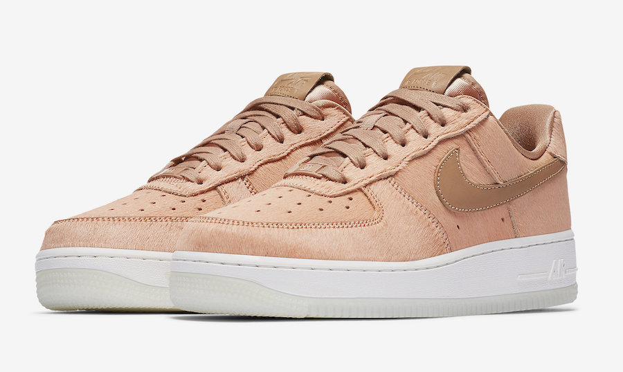 鞋款以裸粉色为主调,鞋面以人造马毛材质覆盖,鞋身 Swoosh Logo 及鞋舌细节都以棕色皮质点缀,搭配白色中底和奶白色水晶底,打造出一双质感极为出众的百搭鞋款。